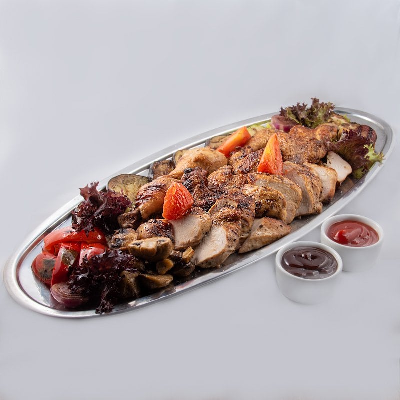 запеченные куриные крылья, ножки, филе с овощами гриль