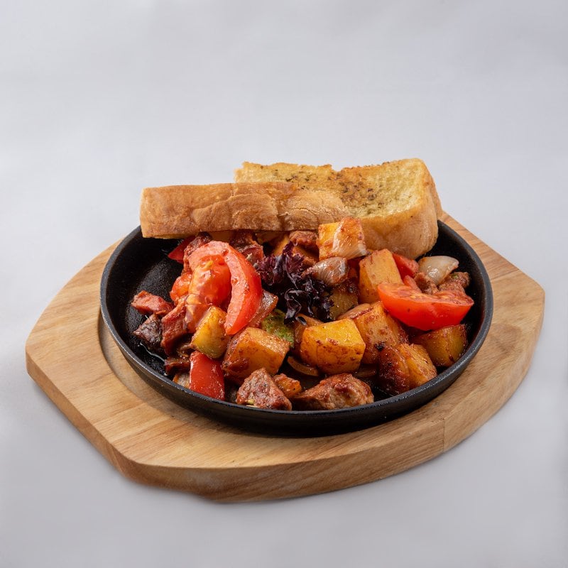 копченая грудинка, мясная вырезка, охотничьи колбаски, картофель, лук, болгарский перец, кабачок, томаты